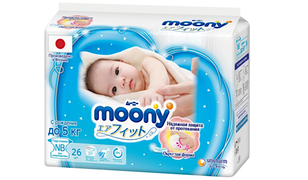 Další japonská značka, která si získala důvěru ruských rodičů. Měkké plenky s vnitřním bavlněným povrchem, který nedráždí pokožku novorozence. Moony používá superabsorbenty, díky kterým se absorbovaná vlhkost přemění na gel, nedostane se na pokožku novorozence, zůstává suchá. Rozsah velikostí je stejný jako u jiných výrobců, ale neexistuje velikost „XS“ do 3 kg. Řada začíná velikostí “NB” (Newborn – novorozenec) – od 0 do 5 kg, ale pro malé děti mohou být příliš velké. K dispozici v malém i velkém balení.
